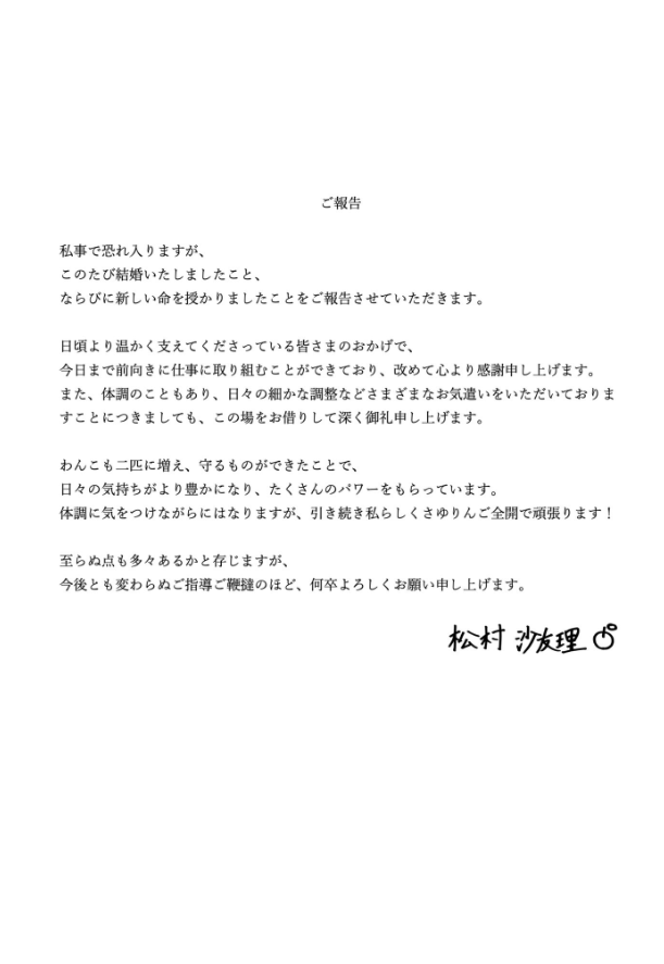 交際報道が出た当初、松村さんは「結婚の段階ではない」と仕事優先のスタンスを見せていましたが、その後関係が深まり、結婚を決断したとみられます。