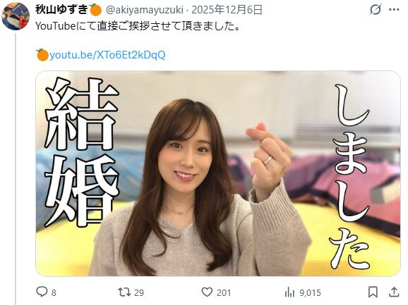 2025年12月6日の公式YouTubeチャンネルでの結婚報告動画【ご報告】秋山ゆずき、結婚しました!の中でお相手が「人との縁を大切にされる方」であることも強調。