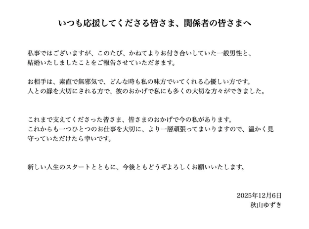 【2025年12月6日発表】秋山ゆずきさん、本当におめでとうございます!お二人の末永い幸せを心よりお祈りしています。