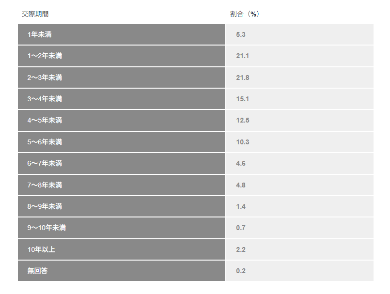 上記のデータ「ゼクシィ 結婚トレンド調査2024調べ」を見てみると、大抵のカップルは5年前後に結婚をするというデータがあります。